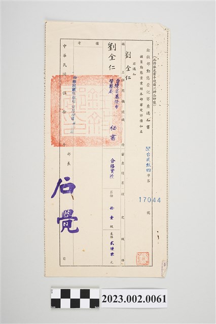 2023.002.0061 民國55年1月6日劉全仁銓敍部動態登記審查通知書