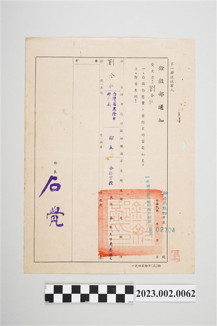 2023.002.0062 民國58年3月14日劉全仁銓敍部通知書