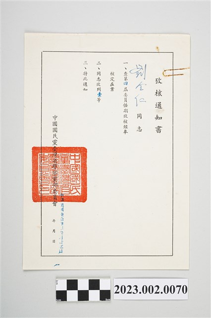 2023.002.0070 民國64年3月22日劉全仁中國國民黨臺灣省警察黨部委員會攷核通知書
