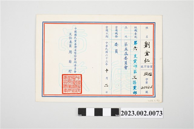 1.本物件為中國國民黨臺灣省警察黨部委員會頒給劉全當選委員之證明書,正面寫有「中國國民黨臺灣省警察黨部委員會證明書」、「(63)興壹字第4289號」、「中華民國六十三年十一月一日」字様,蓋有中國國民黨臺灣省警察黨部委員會紅色關印,內頁寫有劉全仁「黨證字號:組徵字第05024號」、「組織番號:第六支黨部第三區黨部」、「屆次:第五屆委員會」、「當選職務:委員」、「當選日期:中華民國六十三年十月二日」、「中國國民黨臺灣省警察黨部委員會主任委員周菊村」字様,蓋有中國國民黨臺灣省警察黨部委員紅色官印,整個物件保存良好,唯有明顯泛黃現象。2.劉中興黨部是中國國民黨內的特種黨部,主要負責中華民國警察系統,該黨部直接設置在內政部警政署督察室,民國89年(2000)政黨輪替後退出督察室,其下轄的各縣市黨部也改為民間活動。3.劉全仁,民國9年(1920)生,原籍河北省雄縣。民國39年(1950)39 7月至 47 年 (1958)2月擔任臺灣大學駐衛警察隊隊長,期間於民國42年(1953)取得公務員高等考試警察行政人員任用資格,而後歷任臺中市警察局課員、基隆市警察局秘書、經濟課課長、刑事課課長、高雄市警察局分局長、臺東縣成功分局局長。