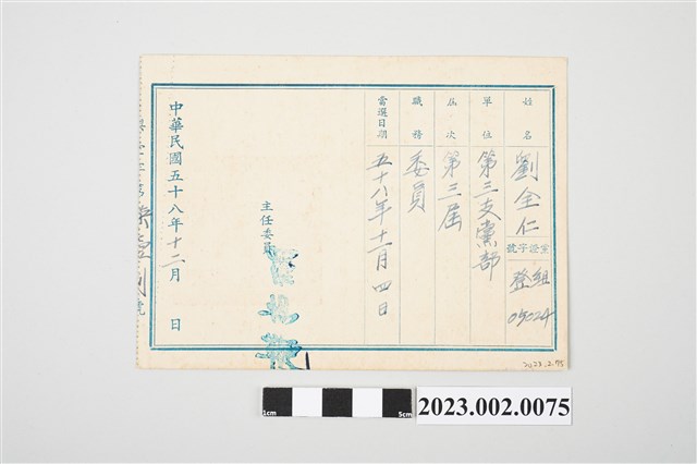 1.本物件為中國國民黨臺灣省警察黨部委員會頒給劉全當選委員之證明書,正面寫有「中國國民黨臺灣省警察黨部委員會證明書」、「(58)興壹字第718號」、「中華民國五十八年十二月」字様,蓋有中國國民黨臺灣省警察黨部委員會紅色關印,內頁寫有劉全仁「黨證字號:登組05024」、「單位:第三支黨部」、「屆次:第三屆」、「職務:委員」、「當選日期:中華民國五十八年十一月四日」、「主任委員羅揚鞭」字様,整個物件保存良好,唯有明顯泛黃現象。