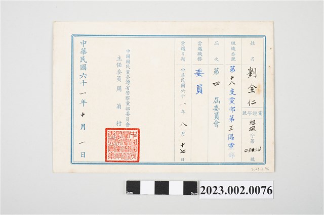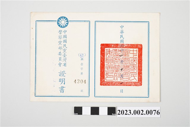 2023.002.0076 民國61年10月1日劉全仁中國國民黨臺灣省警察黨部委員會證明書