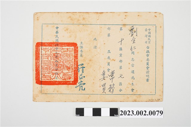 1.本物件為中國國民黨臺灣省臺北市委員會頒給劉全仁當選常務委員之證明書,正面寫有「中國國民黨臺灣省臺北市委員會證明書」、「四九北市君壹證字第1085 號」、「團結奮鬪 建設中華」字様,並印有中國國民黨黨徽,內頁寫有「中國國民黨臺灣省臺北市委員會證明書」、「劉全仁同志當選為本會第十區黨部第七區分部第 屆委員會常務委員」、「此證」、「主任委員羅正亮」、「中華民國四十九年九月廿四日」字様,蓋有中國國民黨臺灣省臺北市委員關防,整個物件保存良好,唯有明顯泛黃現象。