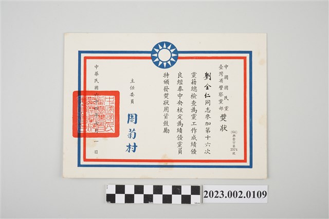 2023.002.0109 民國64年7月1日劉全仁中國國民黨臺灣省警察黨部獎狀