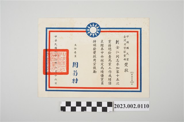 2023.002.0110 民國62年8月16日劉全仁中國國民黨臺灣省警察黨部獎狀