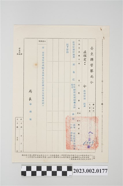 2023.002.0177 民國61年3月23日劉全仁臺東縣警察局令