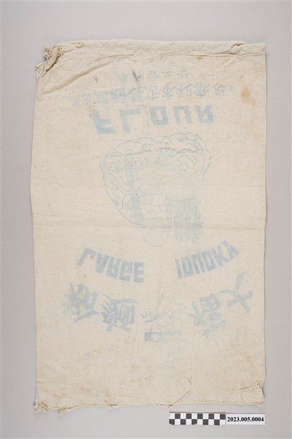 該物件為聯華實業股份有限公司生產之駱駝牌軍用麵粉袋,印有中美合作之圖示標記,由軍用麵粉督導組監製,二十二公斤裝,印有48.3.2應為標示日期,初步判斷應為民國48年所生產製造。
