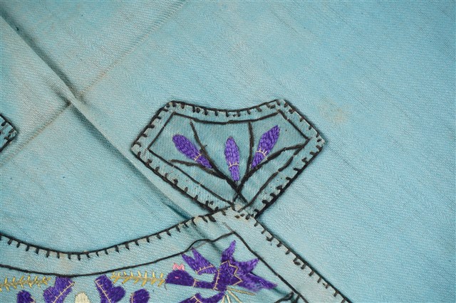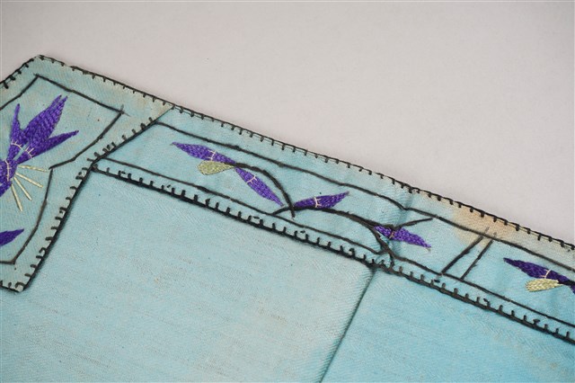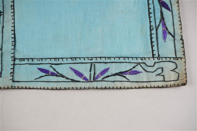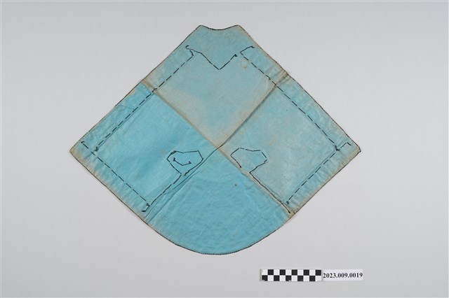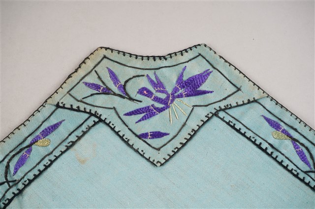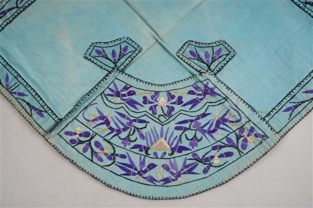 本物件為水藍底彩色飛鳥繡紋菱形肚兜,圍頸部分裁平,正面及反面皆為水藍色棉布,且已有褪色及污損,反面可見不同布料之痕跡。正面紋飾可見緞面繡及鎖邊繡技法,上方圍頸區塊有飛鳥紋及花卉紋,四邊緄邊則為梳齒紋及花卉紋。圍腹布面則可見飛鳥紋、蘭花紋及蜈蚣紋飾。蜈蚣為五毒之首,可嚇阻其他毒物。