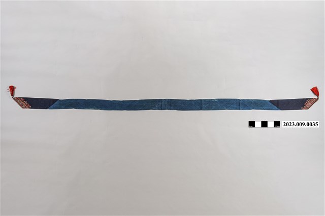 本物件為藏青底平埔族腰帶,腰帶兩端裁成斜角,以梳齒紋緄邊,並以十字鏽形成回字紋、花朵、蟲鳥等圖案。二端斜邊尾端並綴有短流蘇各一。