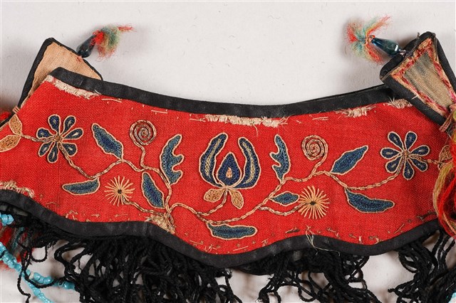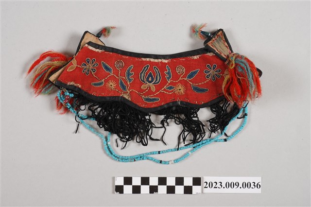 本物件為紅底鑲黑邊五彩繡紋雲肩,正面為紅色底部,以黑布鑲金線緄邊,金線部分已經脫落,布面圖案以緞面繡織成,可見菊花、蘭花紋樣。雲肩二側以棉線綁有飾片與短流蘇,下部亦綴有天藍色串珠及流蘇。