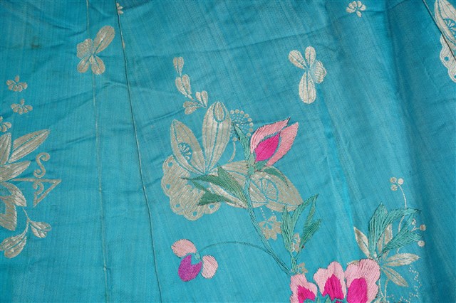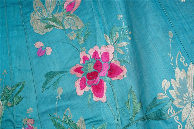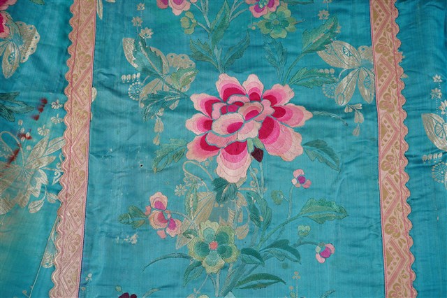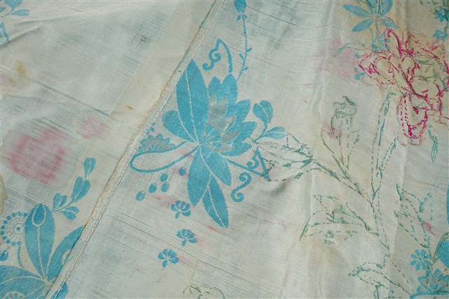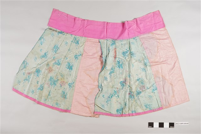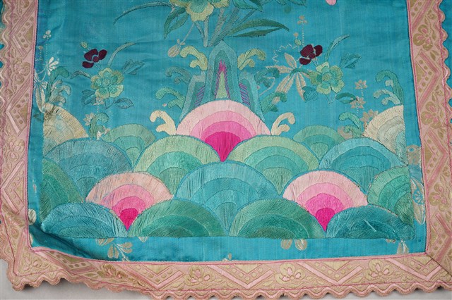本物件為藍底牡丹染印桌裙,分上下兩框,上框為桃紅色素面布片,下框為桃紅鑲藍底,並染印牡丹、蓬萊仙山紋樣。正面中間蓋有印記。
