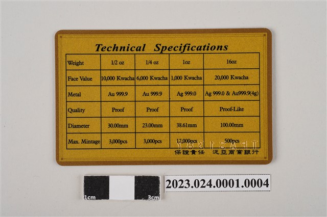 臺灣省議會原於1946年「臺灣省參議會」(原址於今臺北市南海路),為臺灣最高民意機構,後於1951年廢止,設「臺灣省臨時省議會」(1958年遷址臺中霧峰),1959年改為臺灣省議會。1998年省議會廢除後,原址設「臺灣省議會紀念園區」,省政代議制度亦正式走入歷史。此為1998年臺灣省議會改制委託泛亞銀行監製發行紀念金銀套幣,由尚比亞暨荷蘭鑄幣局鑄造。本件保證卡作金底黑字,為尚比亞銀行所認證。