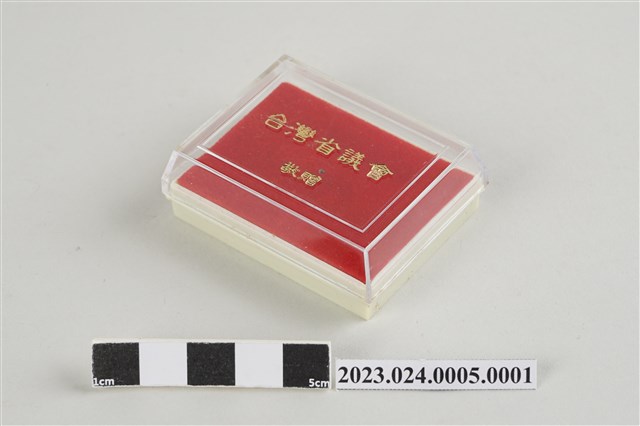 此為臺灣省議會紀念之金屬烤漆徽章,所見徽章作黑底金紋,中央飾有臺灣省議會大樓徽,周圍環繞中英文「中華民國臺灣省議會」字樣。並附長方形塑膠盒,盒蓋印有金字「臺灣省議會敬贈」。