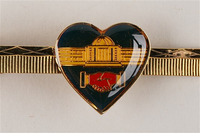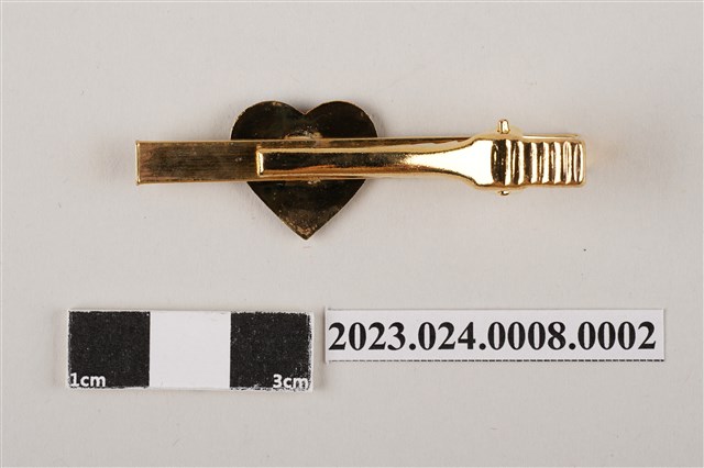 該領帶夾裝飾作心形,作金屬烤漆黑底金紋,中央為省議會大樓徽及握手標誌,應為省議會時期所發行之紀念領帶夾。 臺灣省議會原於1946年「臺灣省參議會」(原址於今臺北市南海路),為臺灣最高民意機構,後於1951年廢止,設「臺灣省臨時省議會」(1958年遷址臺中霧峰),1959年改為臺灣省議會。1998年省議會廢除後,原址設「臺灣省議會紀念園區」,省政代議制度亦正式走入歷史。