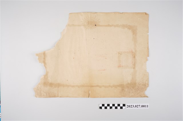 為1951年10月溪湖鎮大竹里長服務十五年獎狀,獎狀上方有「自治」字樣紋飾、底圖寫有「人民先鋒」,以毛筆字書寫,係由縣長陳錫卿頒發給徐石慶之獎狀,該獎狀右邊部分破損、有折痕、裂痕及霉斑。