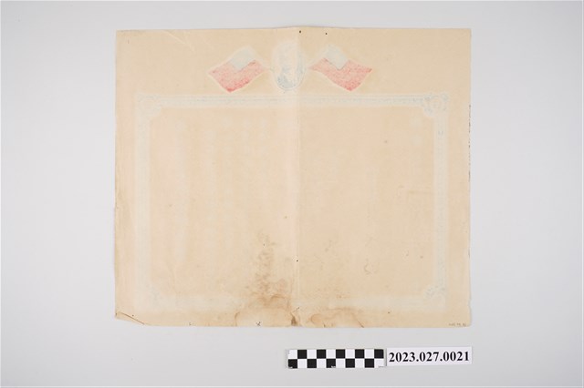 為1958年7月15日彰化縣警民協會證書,證書上方有國父與國旗,邊角飾有「警」「民」「協」「會」圖樣,以毛筆字書寫,為彰化縣警民協會理事長呂世明頒發給徐石慶先生之溪湖警民支會常務監事當選證書,該證書內容清晰,中央有折痕、破損、蟲蛀痕跡、下半部有霉斑。