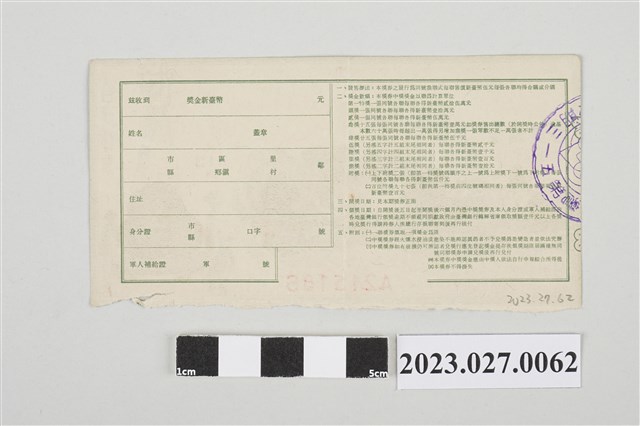 為1969年第513期愛國獎券,為橫式票面,票面設計為臺灣林業太平山林場,愛國獎券面額為新臺幣5圓,開獎日為1969年3月25日,編號為A215186,係臺灣省政府委託臺灣銀行發行,背面印有愛國獎券兌換表格與相關說明,此票券保存良好,有對折痕跡。