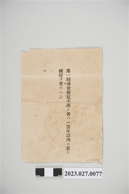為種痘證,由員林郡溪湖庄執勤公醫楊本開立(公醫為衛生行政補助機關之醫務人員),內容為臺中州員林郡溪湖庄汴頭字大竹圍107番地昭和11年7月13日出生戶主徐九孫子徐昭昇於昭和12年2月初次接種預防天花之牛痘疫苗證明,並標記善感(種痘後效果良好),證明背後則寫有「初次接種若屬不善感(種痘未顯現效果)者,須進而於一年內施行第二次接種」之說明,該證明有皺褶、破損與鏽蝕痕跡。