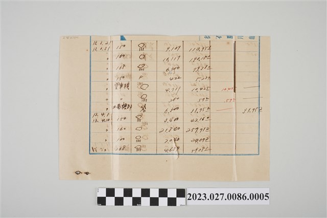 為昭和13年期砂糖包裝文件信封,信封裝有製糖經費、總產量等相關文件,以手寫寫於印有「徐石慶用紙」之稿紙(其中一頁內容寫於汽車構造裝置申報書背後)內容為公司的收入紀錄、昭和12、13年期砂糖總成交量、砂糖包裝、三番糖卸與貨車積之數據紀錄,該文件整體泛黃,有訂書針造成金屬鏽蝕痕跡、折痕與斑點。