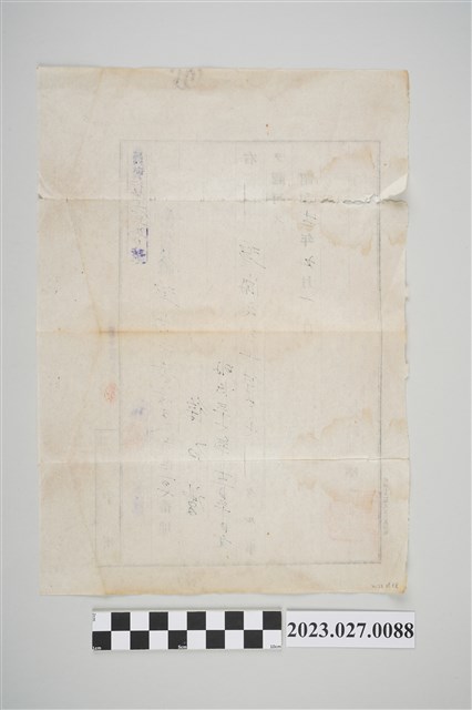 為昭和12年7月1日徐石慶保正證明文件,文件右上有「員警行第6350號」,右下蓋有「荒木」,左下蓋有「臺中州知事印」,內容為承認溪湖庄汴頭字大竹圍107番地明治37年12月20日出生徐石慶擔任溪湖庄60保保正一事,該文件整體泛黃,有折痕、破損與水漬霉斑痕跡。