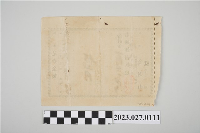 為大正14年8月6日員林郡溪湖庄二三九番地金財山收據,最左邊寫著足赤金葉,其內容(品項)應為耳交頭,重量為2.4厘,價格為1.44円(以蘇州碼紀錄),合計1円364錢,並於最後附上時間、地址與店主黃超等字樣。整體有摺痕與破損、髒汙等痕跡。