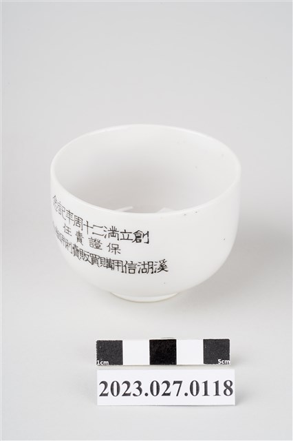 為溪湖信用購買販賣利用組合創立滿二十周年紀念陶瓷杯,該瓷杯為白瓷,保存良好,僅底部有髒汙。杯緣本身有文字「創立滿二十周年紀念 保證責任 溪湖信用購買販賣利用組合」與「同榮共存」徽章,杯底則有九谷藤田製。整體瓷杯屬於敞口短圈足式。