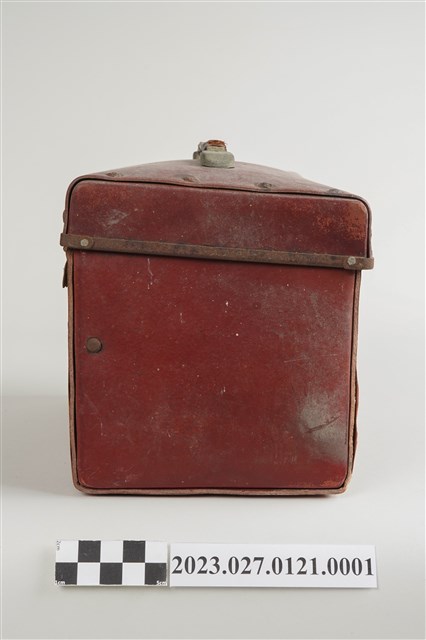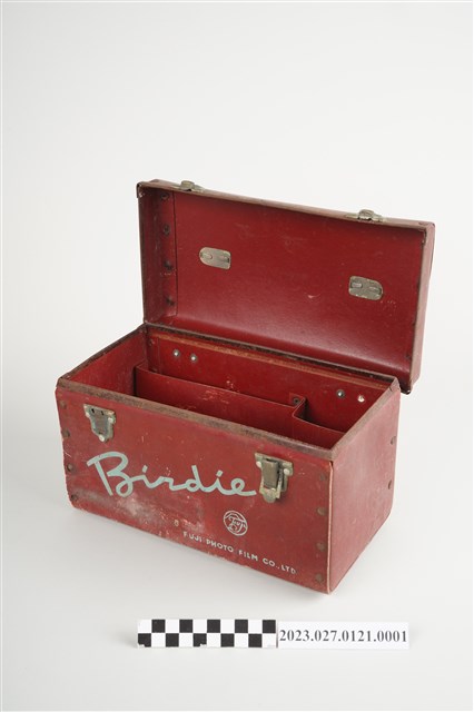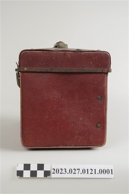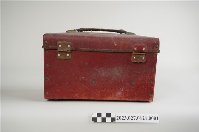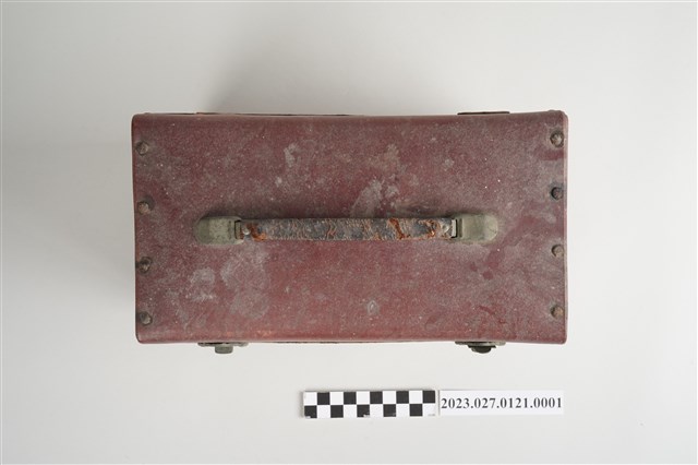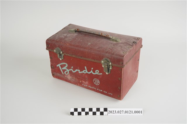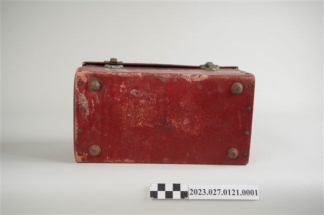 為35釐米放映機,含外盒。盒子為木製,紅色,上頭開蓋有提把,盒子連接處皆為鐵製鎖器,整體多有髒污傷痕與生鏽痕跡。盒子裡除了綠色放映機本身外,還有其相關零件與自動車用電球、燈泡等物件。