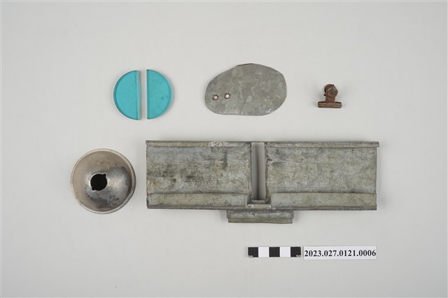 為35釐米放映機,含外盒。盒子為木製,紅色,上頭開蓋有提把,盒子連接處皆為鐵製鎖器,整體多有髒污傷痕與生鏽痕跡。盒子裡除了綠色放映機本身外,還有其相關零件與自動車用電球、燈泡等物件。