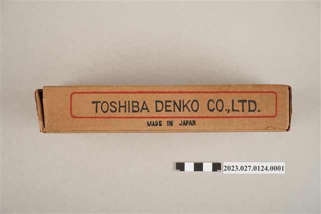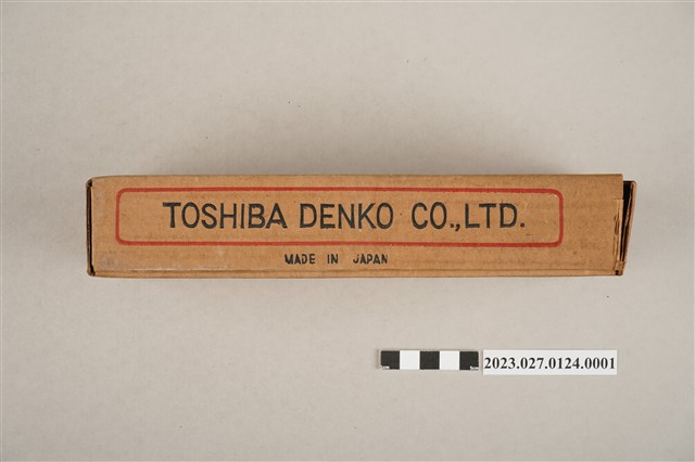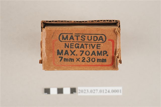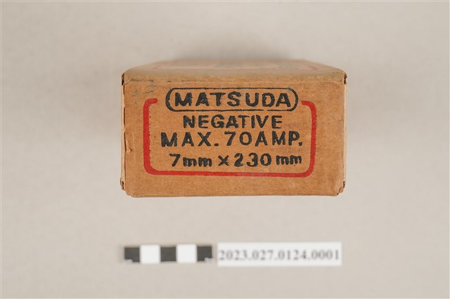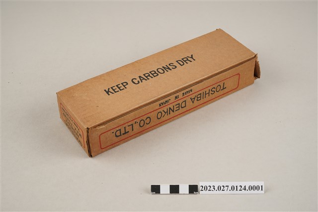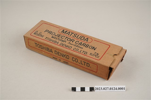 為TOSHIBA出產7mmx230mm碳精棒,其外包裝為物件紙盒,盒面上有文字「MATSUDA PROJECTOR CARBON TOSHIBA DENKO CO LTD」等字樣,外盒形制完整,唯有髒污與些微破損。盒內即為由塑袋套裝戴之碳精棒,為長筒狀、橘色,約53隻左右。