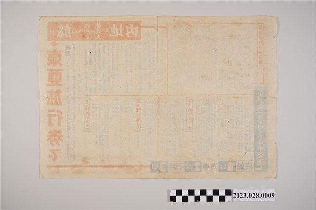 1.本物件為東亞旅行券,為1長方型紙張,最旁邊印有「東亞旅行券」字樣,內容包含內第、朝鮮、滿州國及支那旅行說明,包含搭乘工具費用說明,旁邊還有票券發行地點,物件右上角有1方框,上面寫有東亞旅行線之路線圖。2.日治時期因臺灣總督府推動觀光事業,加上交通日趨便利,刺激了觀光旅遊活動的發展,初期只有高官權貴能享受,隨著時間演進,觀光產業的效益與規模才逐漸擴及民間。1945年日本殖民者離開臺灣,但他們留下的交通與觀光建設,成為臺灣觀光業的珍貴資產。