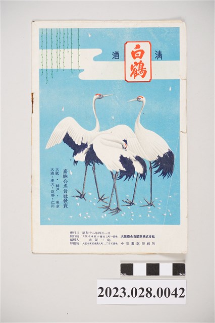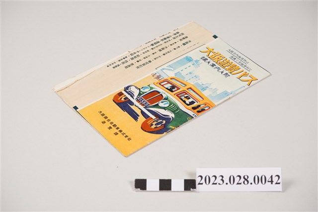 本物件為大正13年大阪旅遊手冊,為1本方形紙張共8頁,第一面印有彩色觀光巴士圖案,上方並寫下「大阪遊賀バス婦人案内人附」字樣,第二頁開始則有大阪旅遊地圖索引、以及各景點之文字及圖片介紹,包含大阪驛、造幣局、大阪城、放送局、四天王寺、松阪屋百貨店等地點都有記載於內,封底處則為白鶴清酒廠商之廣告,並印有發行單位資料。