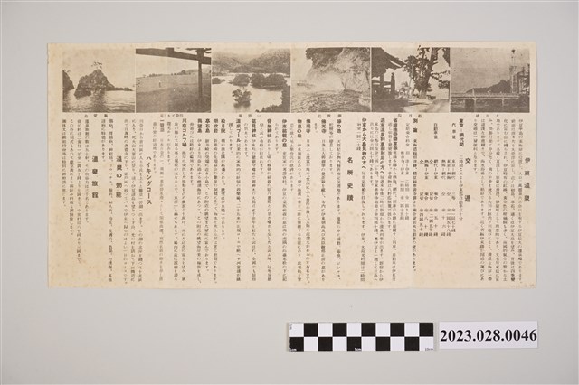 本物件為伊東溫泉旅遊手冊,為1長方形4折頁,共兩面,封面處寫有「伊東溫泉」,並繪有彩色伊東溫泉圖案,下方寫有伊豆伊都溫泉旅館組合,右邊上方則繪有彩色伊東溫泉店家分布圖,中間則印有伊東溫泉旅館之名冊,另一面寫有伊東溫泉之交通、名勝古蹟以及溫泉效能說明,也穿插照片說明。