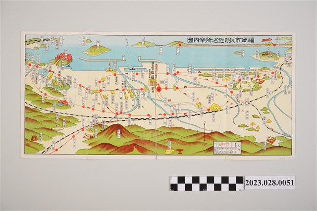 本物件為福岡市觀光地圖,為1長方形紙張4折頁,左上處寫有「福岡市觀光地圖」,並繪有1架騰空而飛的飛機,下面寫有博多織元五合資會社後藤等資訊,旁邊則載明竺前博多的旅遊資訊,另一面則會有彩色福岡市及附近之旅遊地圖,將福岡各景點都繪製出來。