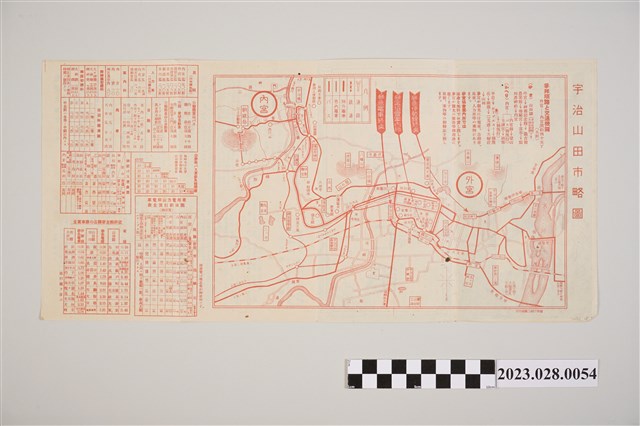 本物件為神都旅遊手冊,為1長方形紙張4折頁,共兩面,左上處寫有「神都案內」,並繪有月光下2隻公雞,下面寫有宇治山田市役所內與參宮協會,旁邊寫有神都旅遊各景點介紹,中間則寫有參宮旅遊的介紹及宇仁館相關資訊,另一面則繪有宇治山田市地圖,將神都各景點都繪製出來。