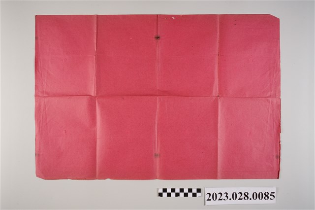 本物件為天一坊飯店菜單,為1紅色長方形紙張4折頁,右邊上寫有「菜單 天一坊飯店」,旁邊並有飯店之地址與電話相關資料,菜單種類十分多元,有海為珍品、魚類、蝦類、雞鴨類、甜菜、湯菜、冷食、燒炒炸滷類、火鍋類、點心類及麵類,菜單有中文及日文。