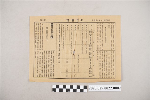1.本物件為中華職業教育社發行《生活》第二卷第四十期生活增刊,正面登載文章「職業教育新聞」,背面則為文章「社務報告」。