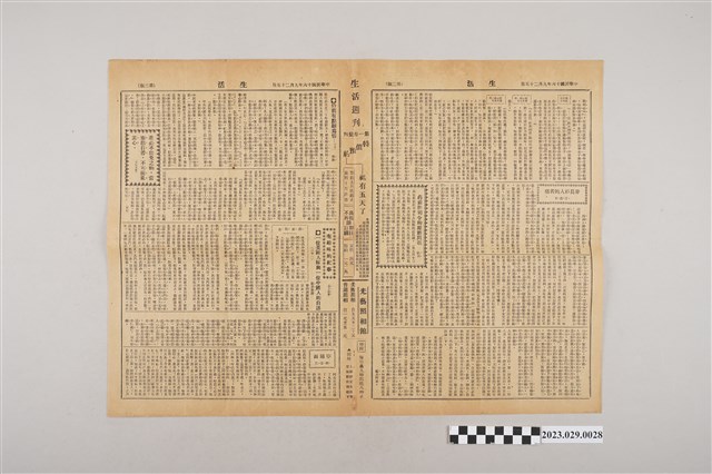 1.本物件為中華職業教育社發行《生活》第二卷第四十七期,正面寫有「本期目次」記載當期文章題名,正面寫有小言論「大失所望」、「外國人嘴裏的中國新式婚姻(中)」等文章;背面為文章與廣告,寫有讀者通訊專欄「上海職業指導所轉來的一封信」、「一件痛心事」等文章,並刊登上海職業指導所、工商銀行、商務印書館等商家廣告;翻開內頁為文章,文章包含「穿長衫人的痛苦」、「蔣前總司令的離婚問題」、「仍舊有點難為情(上)」等。2.《生活》發行時間自民國14年(1925)10月11日至民國22年(1933),旨以用生動的文字、趣味的題材來暗示人生修養,民國15年(1926)10月鄒韜奮接手主編後,開始宣傳抗日思想。
