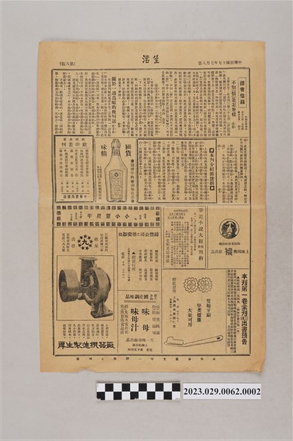 1.本物件為中華職業教育社編輯《生活》第三卷第三十四期第五版,由中華職業教育社編輯,正面刊載文章及廣告,文章題名為「一位英國女士與孫先生的婚姻(二十六)」;背面為文章與廣告,寫有「不知『情』是怎麼樣」、「關於一週鳥瞰的幾句話」等文章,並刊登天廚味精廠、厚生製造機器廠等商家廣告。