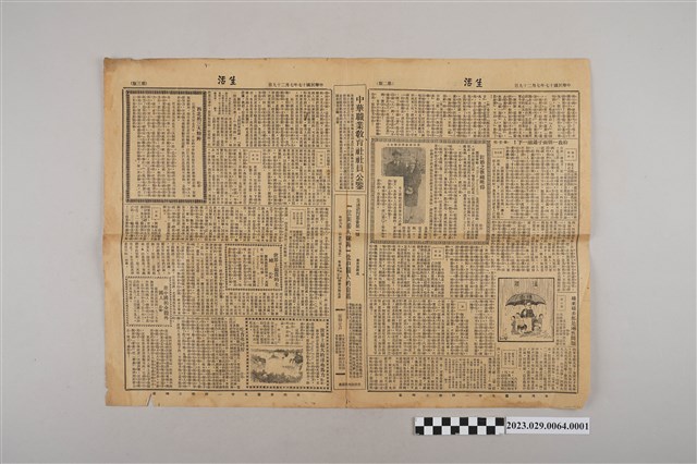 1.本物件為中華職業教育社編輯《生活》第三卷第三十七期,正面寫有「本期目次」記載當期文章題名,正面文章為小言論專欄,本期題目為「翩翩濁世之佳公子也!」,另刊載文章「國民黨與中華民族之慘痛」;背面為文章與廣告,寫有「一週鳥瞰」等文章,並刊登商務印書館、四行儲蓄會等商家廣告;翻開內頁為文章,文章包含「給我一個面子通融一下!」、「西北三大精神」、「在中國的全體外國人」等。