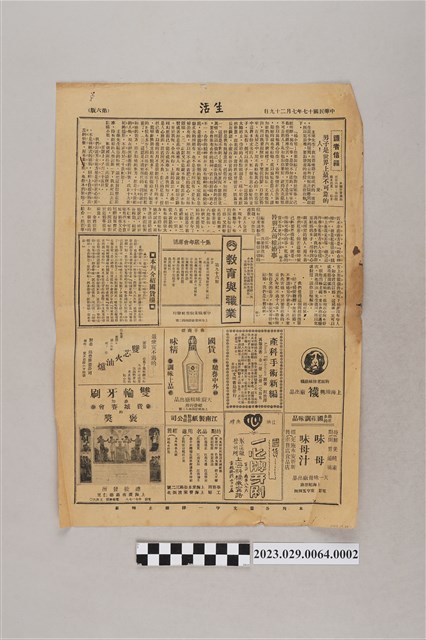 1.本物件為中華職業教育社編輯《生活》第三卷第三十七期第五版,正面刊載文章及廣告,文章題名為「一位英國女士與孫先生的婚姻(二十九)」;背面為文章與廣告,寫有「男人是世界上最不可靠的人!」、「替朋友商榷婚事」等文章,並刊登天一味母廠、中華職業教育社等商家廣告。