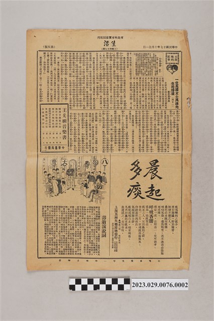 1.本物件為中華職業教育社編輯《生活》第三卷第四十九期第五版,正面刊載文章及廣告,文章題名為「一位英國女士與孫先生的婚姻(四十一)」;背面為文章與廣告,寫有「能毫無舉動上也」、「女教員問題」等文章,並刊登中國天廚味精製造所、上海雙輪牙刷公司等商家廣告。