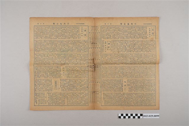 1.本物件為三六九小報社發行《三六九小報》第二號,發行人為趙雅福,正面有金義興商行、時敏齋本店、安輪自動車商會等8個廣告;背面雜爼專欄有「我的美人之美」、詩學秘方等內容;翻開內頁有史遺專欄「談蕭瑞芳」、諧鐸專欄「噴飯錄」、鬼話等文章,說海專欄有長篇小說「蝶夢痕」、短篇小說「浪漫女」。2.《三六九小報》發行時間自昭和5年(1930)至昭和10年(1935),旨以刊登戲謔、針砭時事之文,反映當時的社會狀況。