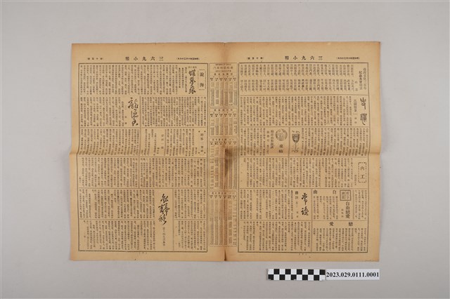 1.本物件為三六九小報社發行《三六九小報》第十五號,發行人為趙雅福,本報正面為廣告業,可見長壽齒科醫院、和光醫院、鄭三妹洋服店等廣告;背面有雜爼專欄「荒唐齋小話」、噴飯錄、下方花叢小記有兩名女子照片;翻開內頁有「臺灣文化三百年紀念大會頌言」、「自由戀愛」、長篇小說「蝶夢痕」、「嫖客三要素(二)」等文章。2.《三六九小報》發行時間自昭和5年(1930)至昭和10年(1935),旨以刊登戲謔、針砭時事之文,反映當時的社會狀況。