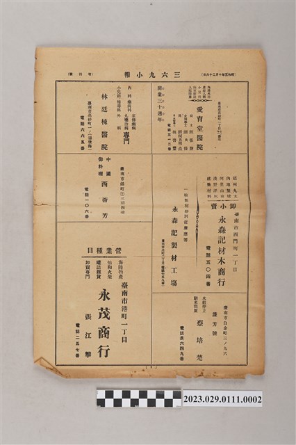1.本物件為三六九小報社發行《三六九小報》第十五號增刊號,正面為「頌臺灣文化三百年紀念徵詩詞宗」,刊登前十名得獎詩詞,並有趙雲石之評論,下半部有「社會人物兩面觀」、「質問欄」、「𨑨迌間點煙盤序」等專欄;背面為6個廣告,分別為愛育堂醫院、林廷棟醫院、永森記木商行、中國御料理西薈芳、永茂商行、謙芳號等單位。2.《三六九小報》發行時間自昭和5年(1930)至昭和10年(1935),旨以刊登戲謔、針砭時事之文,反映當時的社會狀況。