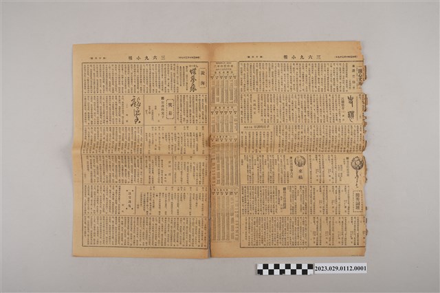 1.本物件為三六九小報社發行《三六九小報》第十六號,發行人為趙雅福,正面為太陽自動車商會、長壽齒科醫院、嘉義西市場前蘭記圖書部等5個廣告;背面為雜爼專欄「嫖界尖端之一幕」等內容,花叢小記有一女子的照片及插畫;翻開內頁有閨秀詞壇、說海專欄長篇小說「蝶夢痕」、笑幕「狡猾的兒子」等文章。2.《三六九小報》發行時間自昭和5年(1930)至昭和10年(1935),旨以刊登戲謔、針砭時事之文,反映當時的社會狀況。