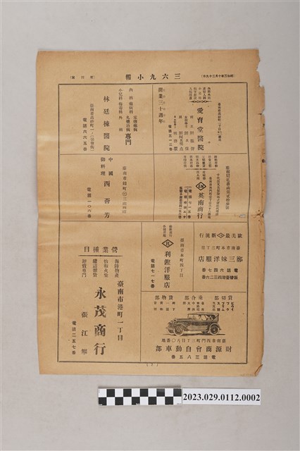 1.本物件為三六九小報社發行《三六九小報》第十六號增刊號,正面為本社滑稽徵詩披露,刊登編輯同人所選的前十名及錄外兩名得獎詩詞,以及詞宗趙雲石所選的頌臺灣文化三百年紀念徵詩錄外六名,下半部有橫式排版的「一個毛斷女的裡影(續前)」等內容;背面為林廷棟醫院、英南商行、中國御料理西薈芳、永茂商行等8個廣告。2.《三六九小報》發行時間自昭和5年(1930)至昭和10年(1935),旨以刊登戲謔、針砭時事之文,反映當時的社會狀況。