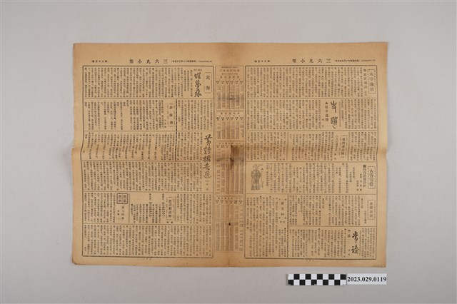 1.本物件為三六九小報社發行《三六九小報》第二十三號,發行人為趙雅福,正面為龍泉電器部、華西洋服店、永森記製材工塲等10個廣告;背面為雜爼專欄「幸盦隨筆」,花叢小記有一女子的照片;翻開內頁有史遺專欄「延平遺聞」、臺灣考古錄「古瓶諸羅外紀」、常識,說海專欄則有長篇小說「蝶夢痕」、診斷書等文章。2.《三六九小報》發行時間自昭和5年(1930)至昭和10年(1935),旨以刊登戲謔、針砭時事之文,反映當時的社會狀況。
