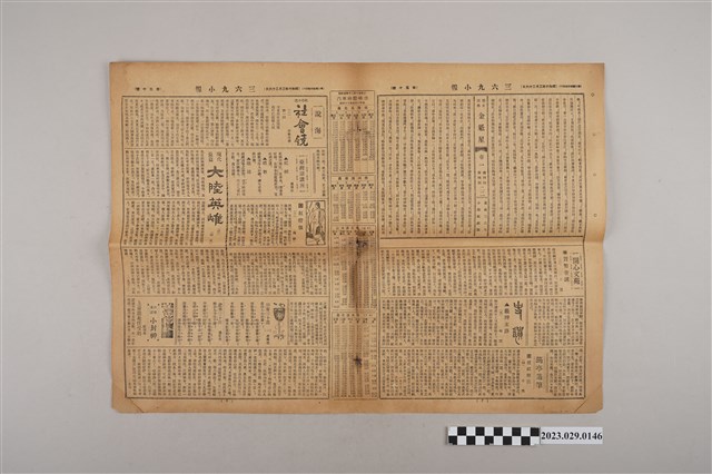 1.本物件為三六九小報社發行《三六九小報》第五十號,發行人為趙雅福,正面為伊達新三郎商店臺南支店、吉豊洋行、平和軒俱樂部等9個廣告;背面為雜爼專欄「各國接吻小史(四)」、海口大學講座」「文姬歸漢」等內容;翻開內頁有明史說部「金魁星」、開心文苑「貨幣會談(二)」,說海專欄社會小說「社會鏡(三)」、現代長篇「大陸英雄(三)」等文章。2.《三六九小報》發行時間自昭和5年(1930)至昭和10年(1935),旨以刊登戲謔、針砭時事之文,反映當時的社會狀況。