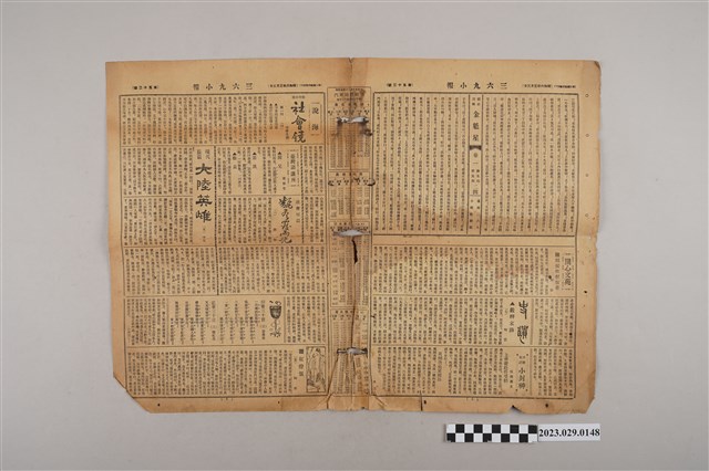 1.本物件為三六九小報社發行《三六九小報》第五十二號,發行人為趙雅福,正面為阿公店興產公司、蘭記書局、興農商會等9個廣告;背面為雜爼專欄「笑劇」、回顧錄等內容;翻開內頁有明史說部「金魁星」、開心文苑「頭髮致鬍鬚書」、滑稽童話「小封神」,說海專欄社會小說「社會鏡第一回(四)」、現代長篇「大陸英雄(五)」等文章。2.《三六九小報》發行時間自昭和5年(1930)至昭和10年(1935),旨以刊登戲謔、針砭時事之文,反映當時的社會狀況。