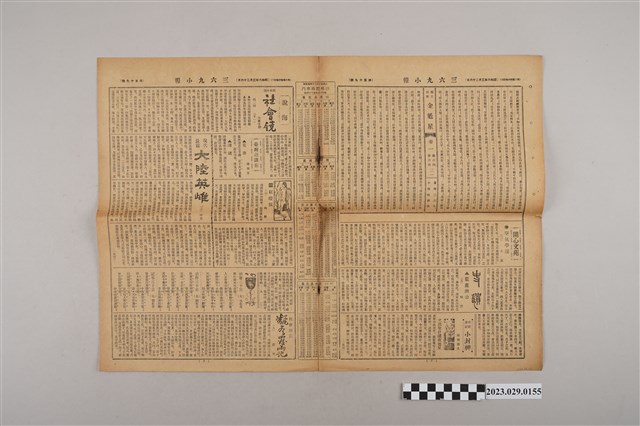 1.本物件為三六九小報社發行《三六九小報》第五十九號,發行人為趙雅福,正面為伊達新三郎商店臺南支店、蘭記書局、太原醫院等9個廣告;背面為雜爼專欄「荒唐齋小話」、憐才妙判等內容;翻開內頁有明史說部「金魁星」、開心文苑「空氣學說(二)」、說海專欄社會小說「社會鏡第一回(十一)」、現代長篇「大陸英雄(十二)」等文章。2.《三六九小報》發行時間自昭和5年(1930)至昭和10年(1935),旨以刊登戲謔、針砭時事之文,反映當時的社會狀況。